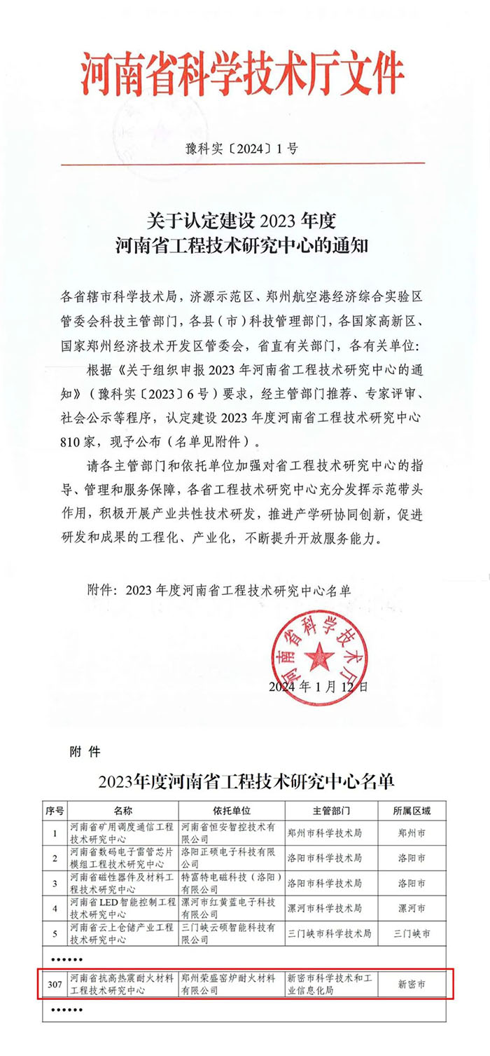 近日,河南省科學技術廳發布了《關于認定建設2023年度河南省工程技術研究中心的通知》。經申報、主管部門推薦、論證和研究等程序,鄭州榮盛窯爐耐火材料有限公司(以下簡稱“榮盛耐材”)申報的“河南省抗高熱震耐火材料工程技術研究中心”正式獲批。