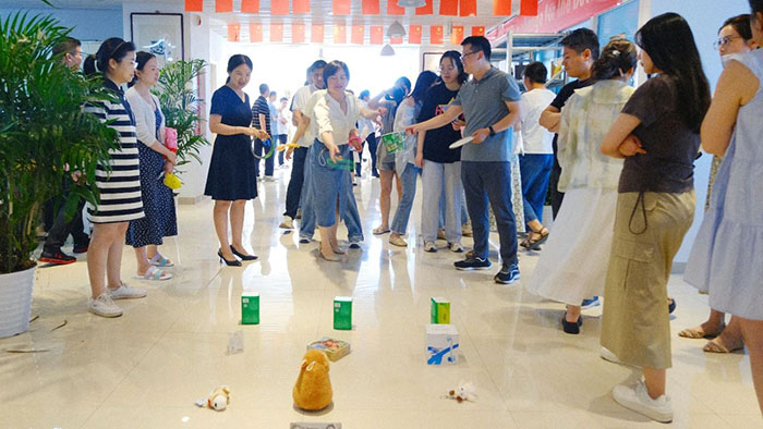 接著近半年入職的小伙伴們輪流登臺做自我介紹,并分隊開始進行丟沙包。這邊用力擲出,那邊左閃右避,不時做出高難度跳躍動作。觀眾們的加油聲高過一陣又一陣,現場洋溢著青春活力氛圍。