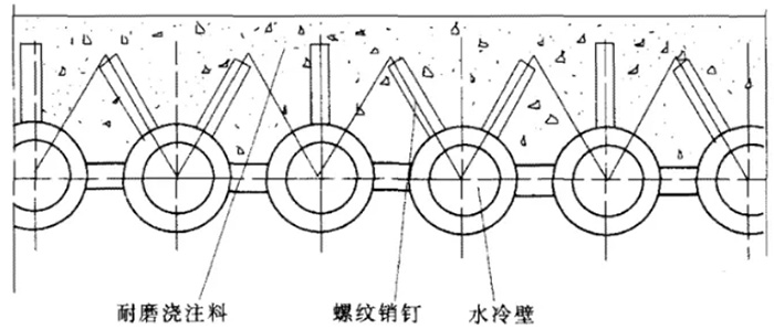 如圖1所示,為循環流化床鍋爐燃燒室下部水冷壁管上耐磨澆注料的施工工藝,耐磨材料是由焊在管子表面上的金屬銷釘固定。由于該區域為燃燒室下部密相區,其物料濃度很高,混合及湍流流動非常強烈,所以磨損非常嚴重。為了防磨,在下部密相區須襯有一定厚度的耐火、耐磨澆注料。