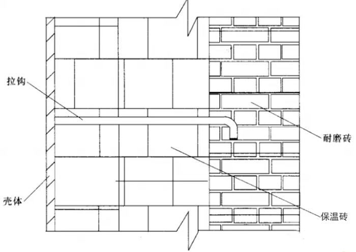 如圖4所示,為耐磨磚襯里+保溫磚型式,為解決膨脹每一定間隔留有膨脹縫,即耐磨磚與耐磨磚之間留有2mm的灰漿縫,耐磨磚分層采用焊在鋼殼上的拉鉤加固,而且為了把耐磨磚的質量分層傳遞到鋼殼上,并在適當高度設有高溫熱強鋼制的托架。這種型式適合大面積平面或圓弧面。