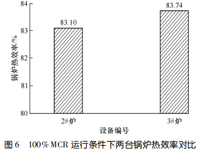 兩臺設備運行 11 個月后進行了能效測試。圖5對比了 90%鍋爐大的連續蒸發量(簡稱 MCR)和MCR 條件下鍋爐一通道的出口煙溫。圖6示出了MCR運行條件下兩臺鍋爐熱效率的對比。結果顯示:在 90%MCR 運行條件下,3#爐一通道出口煙溫比2#爐低 135.9 ℃,在MCR 運行條件下,3#爐一通道出口煙溫比 2#爐低 149.7 ℃,3#爐的熱效率比 2#爐高 0.64%。相較而言,使用膜式壁爐襯的3#爐在負荷相當的情況下,余熱鍋爐熱效率更高。