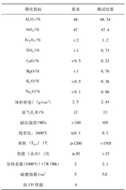 沸騰氯化爐內襯材料主要采用Al?O?和SiO?,物相組成主要為莫來石,主要化學成份及物理性能測試見表1。