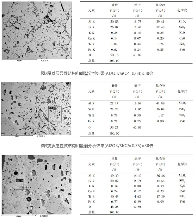 從熱力學上看,Al?O?-SiO?系材料[4]各物相在氯化反應中:莫來石相(A?S?)非常不穩定,其成份見表2,石英相(SiO?)非常穩定,剛玉相(Al?O?)居中;在碳熱還原中:石英相非常不穩定,剛玉相非常穩定,莫來石相居中。在實際中,爐襯材料是如何損壞的,其過程是怎樣發生的,這要從殘磚顯微結構分析入手。