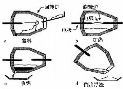 ALUREC法由丹麥阿加公司、霍戈文斯鋁業(yè)公司、曼公司三家公司聯(lián)合開發(fā),流程圖見圖4。主要流程為裝料、加熱、收鋁、倒出浮渣,該法主體設備為回轉式熔化爐,還可以用純氧作助燃劑,升溫速度快,可以有效減少燃燒過程產生的有機氣體,煙塵被煙罩吸收二次利用處理。此法優(yōu)點在于機械化程度較高和運行環(huán)境好;但金屬回收率要比炒灰低,一般在93%左右,且產生的殘余鋁灰還需進一步處理。