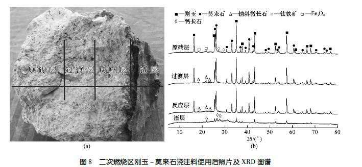 圖8是二次燃燒區(qū)用后剛玉- 莫來石澆注料殘襯照片以及各層的XRD 圖譜。分析表明,反應(yīng)層、滲透層形成了少量的長石類礦物相。在實(shí)際工況下,長石類礦物的熔點(diǎn)較低,高溫是熔融狀態(tài),熔渣與耐火材料反應(yīng)形成的低熔點(diǎn)物向熔渣中溶解,并逐漸被高速含塵煙氣沖刷掉,終導(dǎo)致內(nèi)襯耐火材料被磨穿。