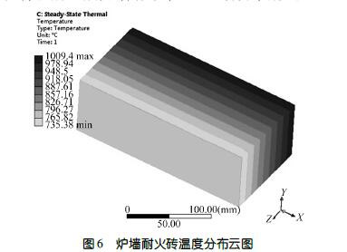 焚燒爐運(yùn)行過程中爐墻受熱,爐墻內(nèi)、外溫度存在差異。爐墻耐火磚模擬分析的溫度分布云圖如圖6 所示,構(gòu)成爐墻的碳化硅磚由內(nèi)部到外部存在較大的溫度梯度。工作面與非工作面溫度的差異使耐火磚向火面產(chǎn)生的膨脹比背火面的大。同時(shí),焚燒爐內(nèi)不同燃燒區(qū)域爐墻溫度分布不均,使?fàn)t墻在溫度較高的部位膨脹量較大。由于爐墻受爐體尺寸的約束,使整個(gè)爐墻產(chǎn)生較大的內(nèi)應(yīng)力,溫度越高的區(qū)域產(chǎn)生的內(nèi)應(yīng)力越大,這導(dǎo)致高溫區(qū)爐墻有向爐內(nèi)凸起、鼓包的趨勢。爐墻鼓包、凸起還與超負(fù)荷運(yùn)營、工藝溫度控制、起停爐頻次、操作水平以及爐墻設(shè)計(jì)有關(guān)。