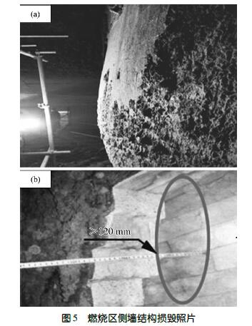 不同焚燒階段,工藝溫度差異較大,各段爐墻受熱不均勻。其中,燃燒段是溫度較高區(qū)域,主要是絕熱爐墻和風(fēng)冷爐墻兩種結(jié)構(gòu),風(fēng)冷爐墻的穩(wěn)定性要明顯好于絕熱爐墻的。但是無論哪種結(jié)構(gòu),服役時(shí)間較長以后,均會(huì)出現(xiàn)鼓包凸起。圖5(a)是絕熱爐墻服役一段時(shí)間后爐墻明顯鼓包照片,中心區(qū)域凸起高度達(dá)到200 mm 以上。圖5(b)示出了爐墻服役過程中的風(fēng)冷爐墻,殘余風(fēng)冷爐墻空氣夾層厚度由設(shè)計(jì)的60 mm 擴(kuò)展為120 mm。