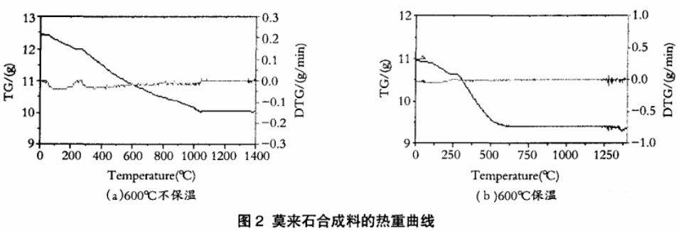 由于DSC-TG分析的測量用料量大多≤100mg,并且要磨成細粉。這種實驗方法很難代表混合料實際的情況,且缺乏均勻性和代表性,從動力學(xué)上也不能反映澆注料加熱過程的實阮變化情況。目前對于尺寸和質(zhì)量大的試樣,只能通過試樣加熱前后質(zhì)量的變化來表征總的反應(yīng)情況。用整體的樣塊大試樣加熱更接近真實。大試樣熱重儀對烘干后的試樣進行熱重分析,測定室溫至1400℃過程中重量的變化,結(jié)果如圖2(a)所示。由圖可知,在連續(xù)加熱不保溫的情況下,質(zhì)量一直到1100℃才保持穩(wěn)定。根據(jù)DSC-TG及大試樣熱重分析結(jié)果,混合料在1200℃以上均可生成莫來石,只是莫來石的生成速度和轉(zhuǎn)化率隨溫度不同而會有所差異。本工作的主要目的是合成具有微孔結(jié)構(gòu)的莫來石骨料,既要求合成料有一定的氣孔率,孔徑小、體密輕,又要求其強度高,即要有理想的莫來石轉(zhuǎn)化率,同時還要兼顧煅燒設(shè)備投資、生產(chǎn)成本等,因此摸索理想熱處理制度對本工作而言至關(guān)重要。