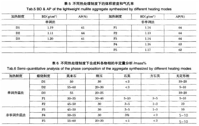 從表5可看出,在一種單調(diào)式升溫方式下,隨著保溫時間的延長,合成輕質(zhì)莫來石骨料的體枳密度呈現(xiàn)先升后降的趨勢,顯氣孔率呈現(xiàn)先降后升的趨勢,這與保溫過程中莫來石化程度相關(guān)。
