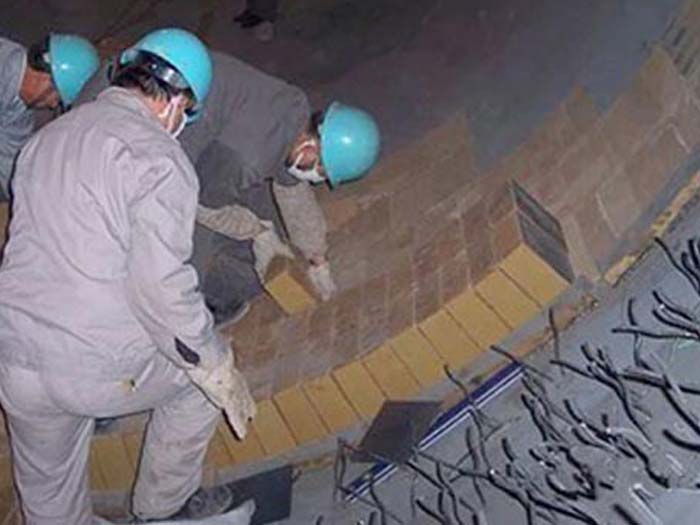 特別在開停較頻繁的窯上使用,壽命大為縮短,沒有窯皮做為屏障的鎂鉻磚,表面溫度隨窯況變化,窯皮頻繁更替,會使膨脹系數較大的鎂鉻磚發生熱疲勞,化學侵蝕,液相堿鹽的滲入使磚結構惡化,降低抗熱疲勞性能,使胴體溫度在此幾環鎂鉻磚處不斷升高,更終紅窯,為了補掛窯皮在胴體表面噴水強制在火磚上形成窯皮,但窯的受熱膨脹對磚襯內壓應力補償作用消失,不利于磚襯壽命,加之,磚體太薄不能形成穩定窯皮,多次紅窯。只有進窯挖補,磚更薄處只有40cm左右。在窯口處2m處的鎂鉻磚也出現過類似情況。