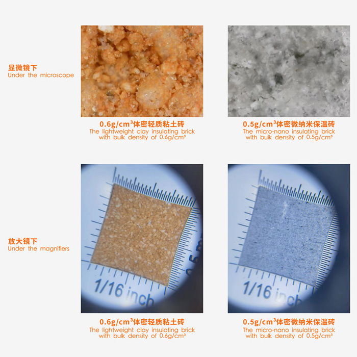 將體積密度0.6 g/cm3的普通粘土質輕質保溫磚和體積密度0.5 g/cm3的新型保溫磚放在顯微鏡下觀察,普通粘土質輕質保溫磚的氣孔大部分為貫通式氣孔,磚體結構松散,而新型保溫磚的氣孔均為封閉式超低氣孔,結構致密。