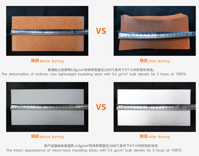 將體積密度0.6 g/cm3的普通粘土質輕質保溫磚和體積密度0.5 g/cm3的微納米保溫磚同時在1050℃下保溫3小時燒后,普通粘土質輕質保溫磚由230mm收縮到190mm,磚體嚴重變形,而新型保溫磚尺寸未發生變化,外觀完好。